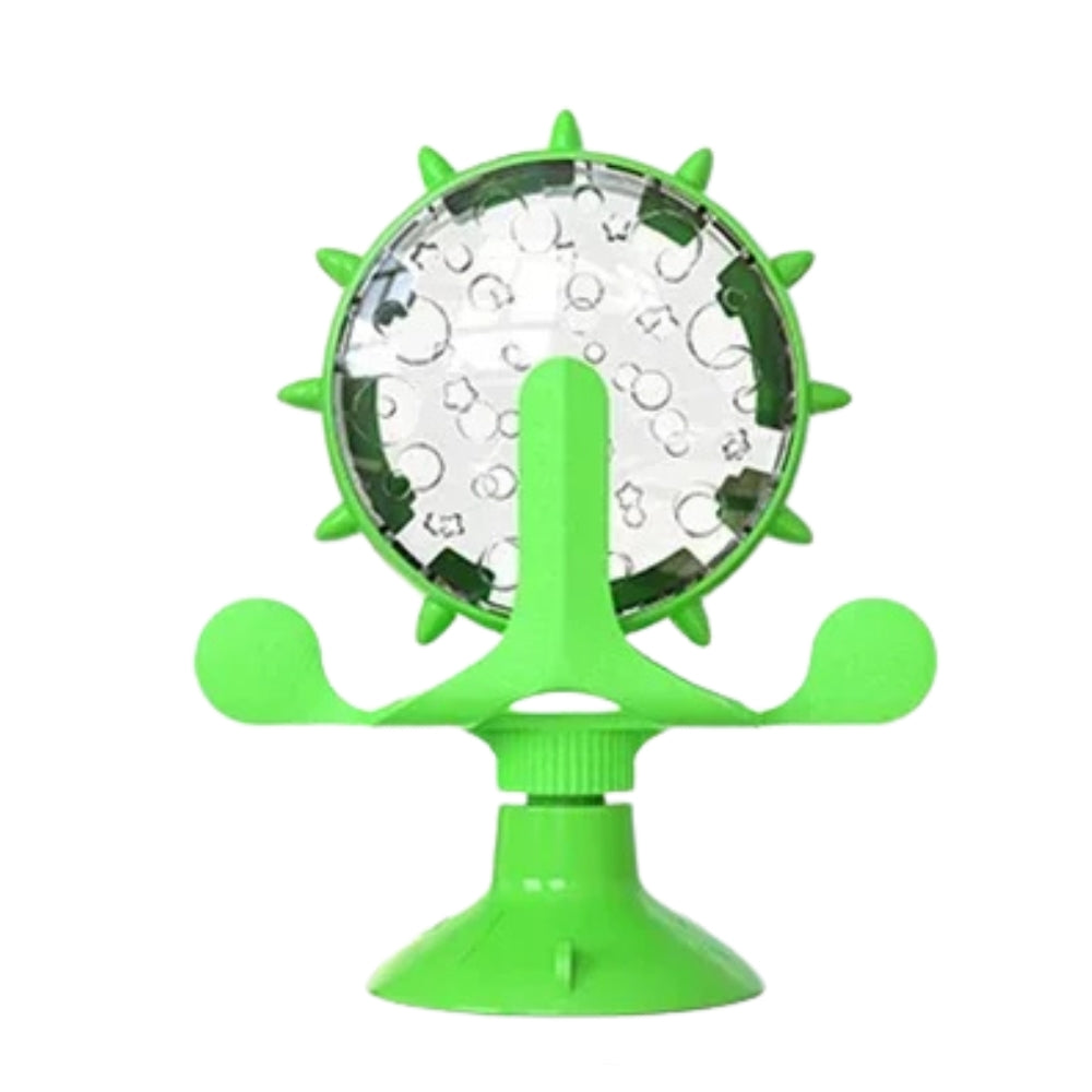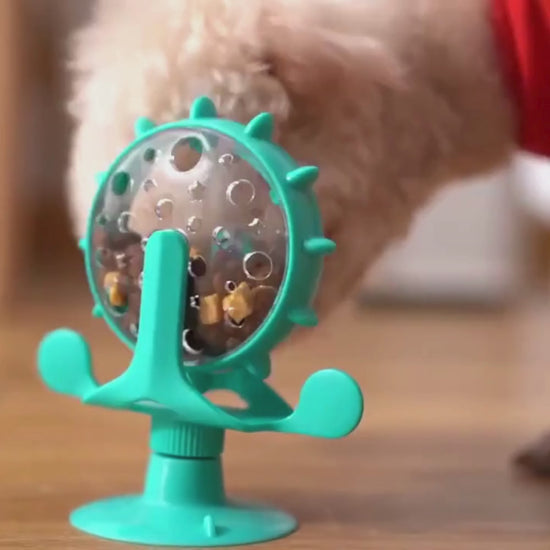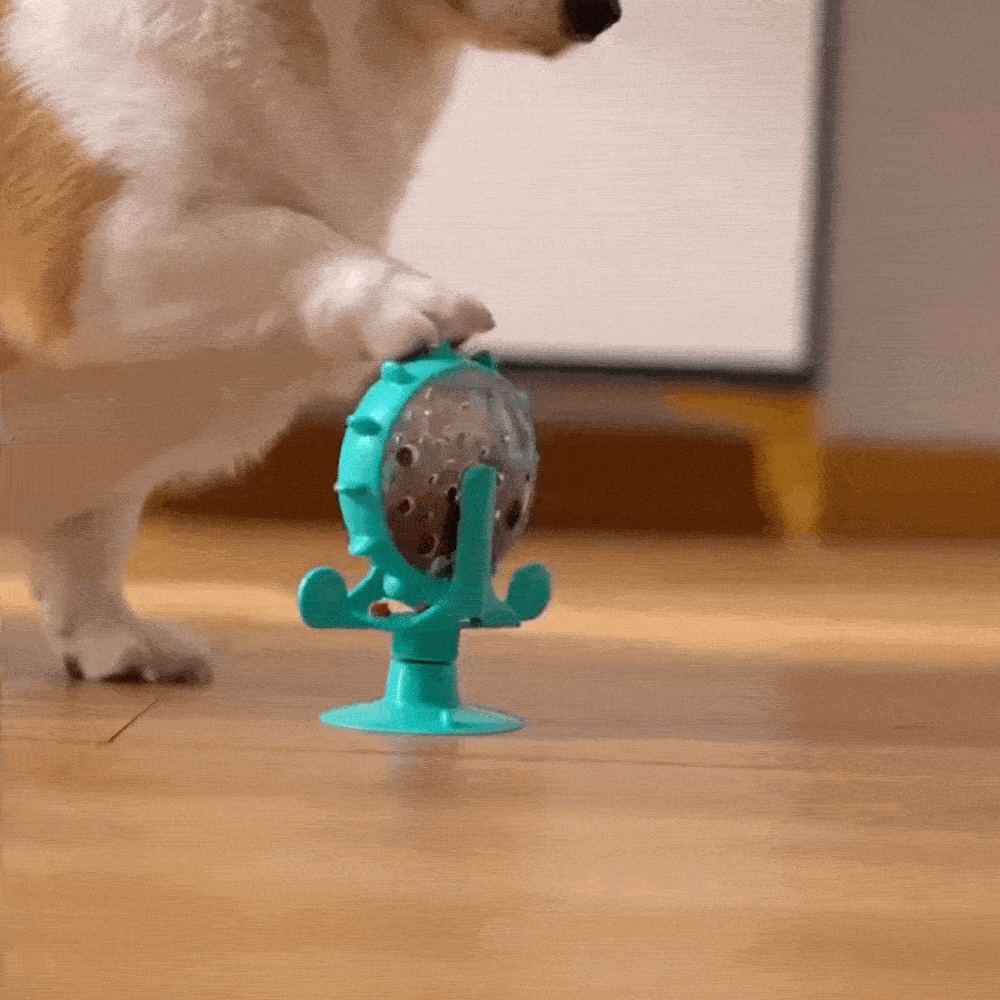 Questo gioco funziona facendo girare la parte superiore: il cane deve dare le zampate per far cadere le crocchette come ricompensa.